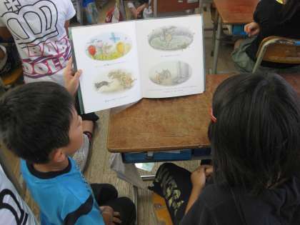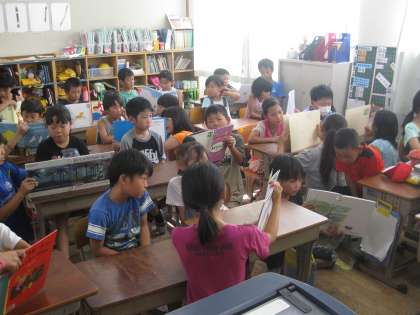 高学年の児童は,低学年の児童に見えやすいように本を提示しながら,一生懸命読んでいました。