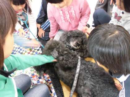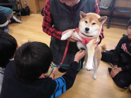 犬へのあいさつの仕方を学び,グループごとに触れたり,心音を聴診器で聞いたりさせてもらい,犬と仲良しになりました。