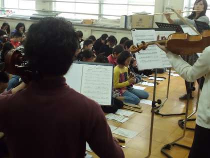 4,5,6年生を対象に音楽ワークショップを行いました。間近にフルートやバイオリン,チェロの演奏を聞いたり,バイオリンを演奏したりして貴重な体験をしました。