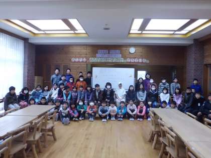 児童を集めて,辻 由美子給食調理員さんと記念撮影をしました。