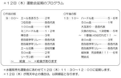 本日実施しておりました運動会ですが,競技途中で急な雨が降ってきました。天気は回復しましたが,グランドコンディションが悪く運動会を続行することが不可能となりました。