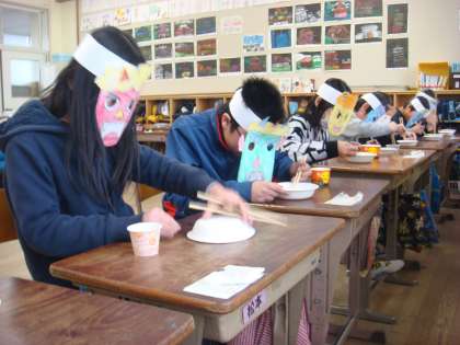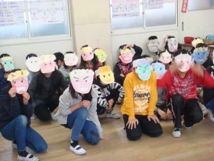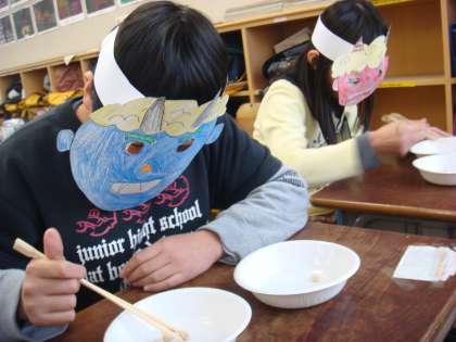 しかし!ただ普通に豆をつまむのではなく,鬼のお面をつけて豆つまみです♪
