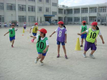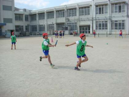 最初は止まったままバトンを受け取る子や,中には両手でバトンを受け取る子もいました。