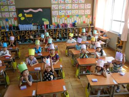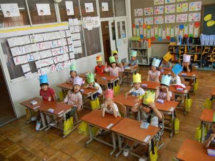 明日の1年生を迎える会に王冠をかぶって入場します。