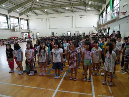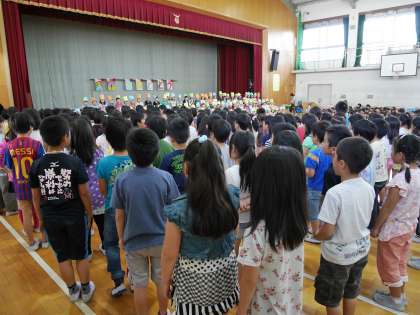 5月14日(木)3時間目に全校で1年生をむかえる会を行いました。2年生からは,お祝いの言葉と「あの青い空のように」の歌を贈りました。たくさん練習を重ね,学年で心をひとつにして出し物を行うことができました。
