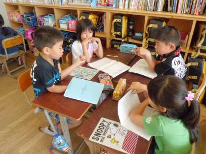 国語の学習で「お話会」をしました。みんなそれぞれ考えてきたお話をします。聞き手は,質問や感想を話します。怖い話や面白かった本の話,習い事の話や家族の話,いろいろと面白い話がありました。これからもっと話をして,話し上手・聞き上手になってほしいです。