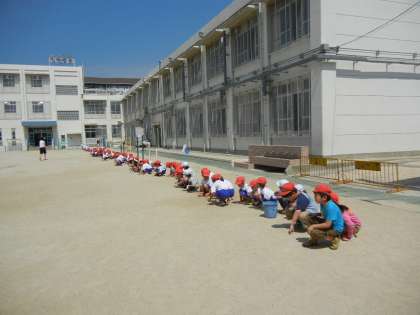 1年生はたいよう学級と一緒に運動場の石拾いをしました。