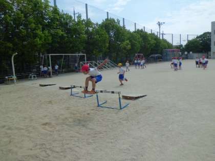 次に,できるだけ上に高く跳ぶことです。踏み切り台だけでなく,前にハードルを置いて練習しました。