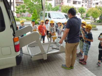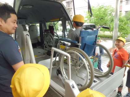 特別に送迎車の中も見せてもらいました。車いすに乗ったまま車に移動できる装置を見て,「わあ〜,すごい!」と声が上がりました。