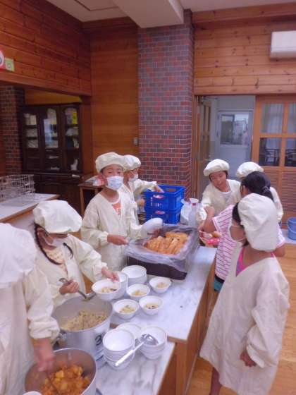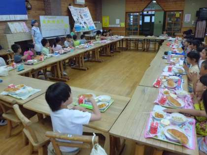 給食指導の後はランチルームへ。今年初めてでみんなウキウキ。久我の杜のランチルームはきれいですね。みんなの会話も弾みます。