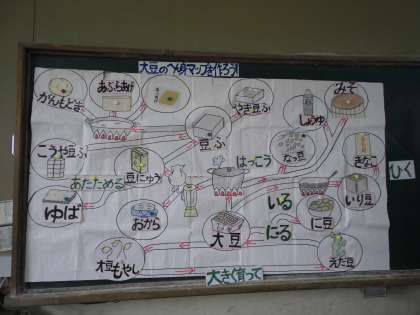 煮豆,豆腐,しょうゆ,みそなど,大豆は姿を変え,毎日の給食の中に登場していることを知り,みんなとても驚いていました。