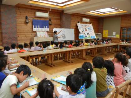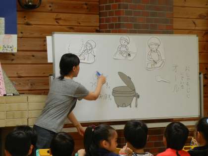 給食室の探検の後は,ランチルームで神殿先生から,給食調理員さんや神殿先生のお仕事についてお話してもらいました。
