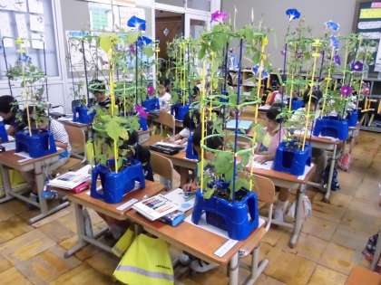 今年の朝顔は,発育がよく,早くから花を咲かせてくれて,子どもたちは大喜びでした。しかし,先日の台風の影響で,葉がたくさん枯れてしまいました。