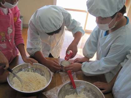たまごを割るのに最初はおそるおそる・・・の子どもたち。しまった,殻が入ってしまった。大丈夫,取ればいいんだから。牛乳はメモリをよく見ながら量ってよ。