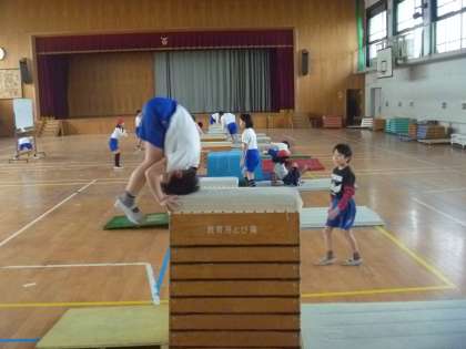 出ました!8段の台上前転です。少しのチャレンジでできました。一人できると後から何人か続きます。いい相乗効果です。