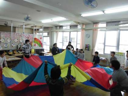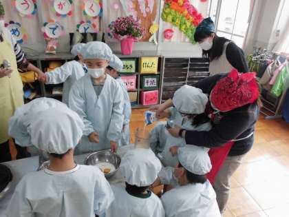 今日は「1年生入学おめでとう,2〜5年生進級おめでとうの会」でホットケーキを焼きました。ボールを押さえる人やかき混ぜる人,生地を焼く人等みんなで協力しておいしくしできました。食後の後はみんなでバルーンを使って体を動かすことができ,とても楽しい会になりました。