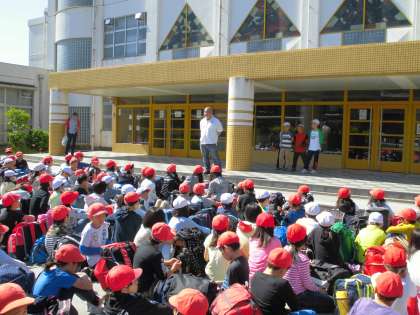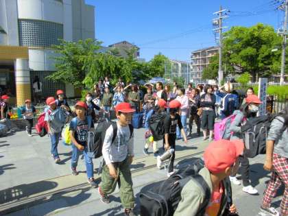大きな荷物を背負う姿にもまだまだ余裕が感じられます。学校での出発式を終え,保護者の方に見送られて出発しました。