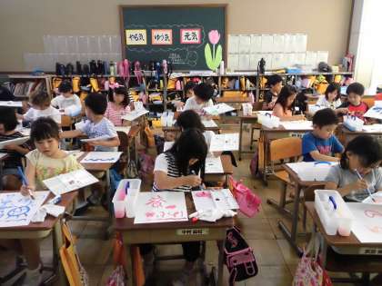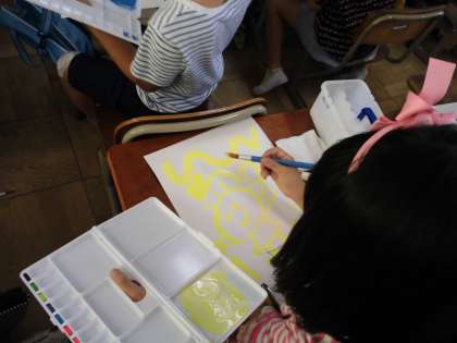 初めての絵具の学習で、それぞれ好きなように筆を走らせ、