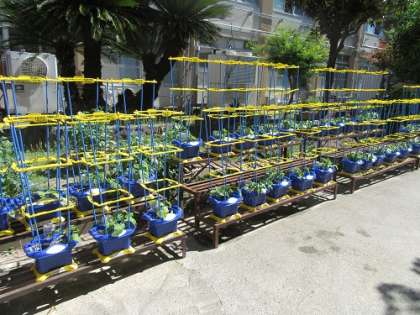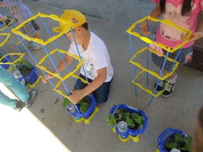 丸い肥料をまんべんなく土にまき,4本の支柱を立てました。