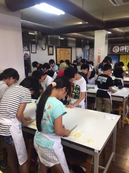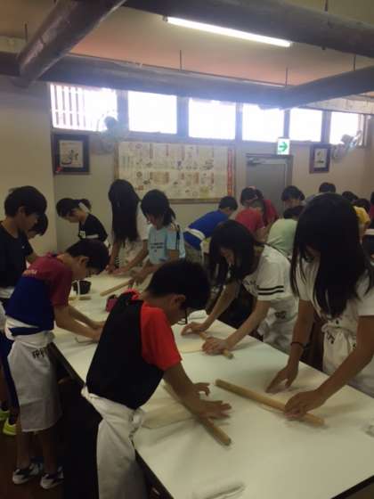 まずは1人1つずつうどん生地を綿棒で伸ばして切って