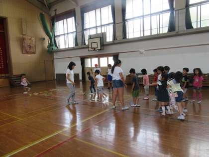 フラフープ,ボール運び,ゴム跳び,けんけんぱの4つのブースに分かれて色々な遊びを体験しました。