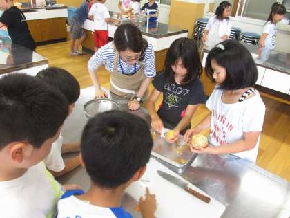 宿泊学習1日目の野外炊事(カレー)にむけて包丁やピーラーの使い方を