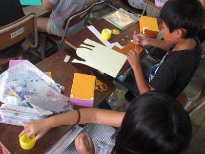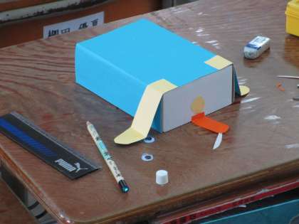動く仕組みをつけた箱にかざりをつけて,思い思いの作品を作り上げます。