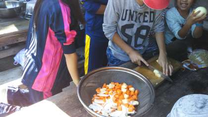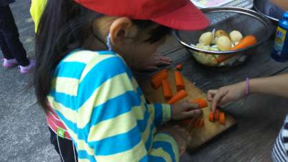 カレーに入れる野菜を慎重に・・・切っています。