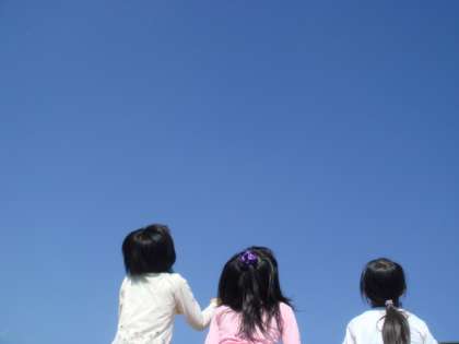 稲かりの帰り道、あまりにもの青い空に、子どもたちが