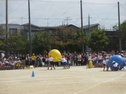 1年生から6年生までが,力を合わせて大きなボールを運びます。