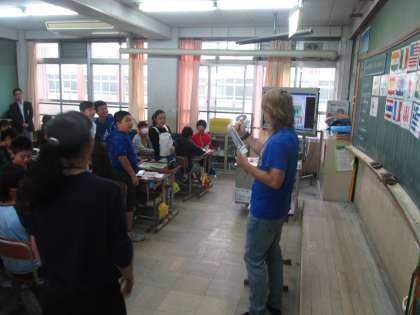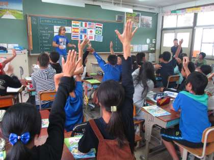 世界の国名に慣れ親しむことが目的で,ヒントクイズやカルタとりゲームをしてたくさん国名を発音していました。