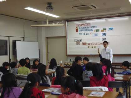 3年生の国語科の教材の一環で,大豆が変身した醤油のひみつを教えていただく出前授業を受けました。醤油の香ばしい香り体験や,しぼりたてのしょうゆやしぼる前のしょうゆの味見体験もありました。料理に使うだけだと思っていた子どもたちもしょうゆの持つうまみに引き込まれた様子でした。