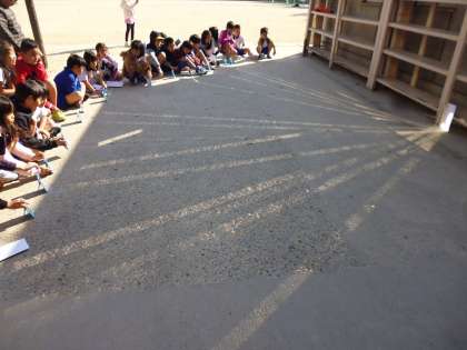 理科の学習で,太陽の光の性質を調べています。太陽の光は鏡ではね返すことができて,まっすぐに進みます。みんなで一つの的に向かって光の道を作ってみました。