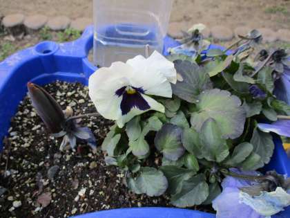みんなで植えたパンジーとチューリップ。少しずつ大きくなっています。チューリップの芽が伸びだしています。