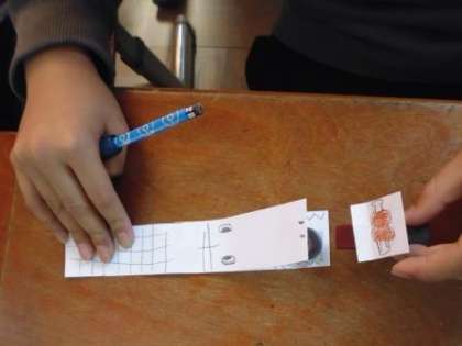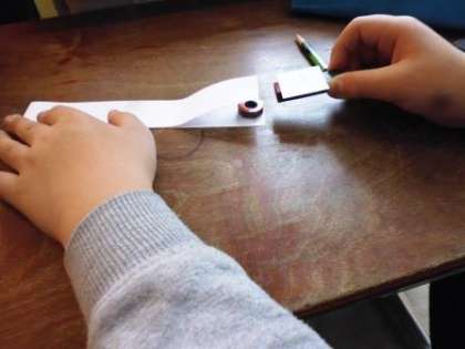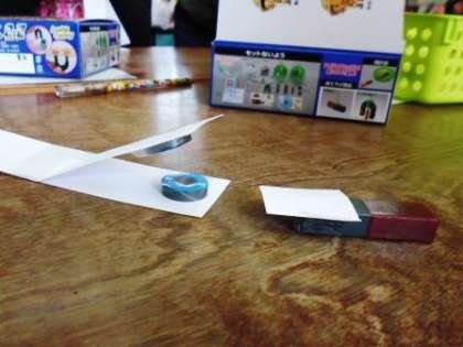 じしゃくのふしぎをいろいろ見つけた後,じしゃくを使ったおもちゃを作りました。画用紙を細長く切り,丸い形の磁石を先端につけ,それをワニに見立てて「肉がきらいなワニをつくってみよう」とめあてを伝えました。じしゃくの性質をよく知っている子どもたちは,すぐにひらめいたようで,さっそく作って遊び始めました。ワニや肉の絵を描いたものをはりつけて満足そうに楽しんでいました。