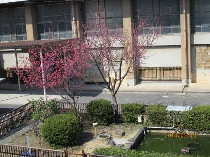 1年生の教室から亀池が見えます。そこのお花がとてもきれいに咲いています。今日は温かく,お花の開花もすすんだように思います。春めいています。