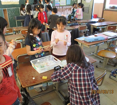 やすみ時間に,栄養の先生,大杉先生がおはし名人のテストをしてくれています。おはし名人めざして1年生はがんばっています。今日も,また合格者が出ました。合格した人が教えてあげる姿もありました。2年生になるまでに,全員合格を目指しています。