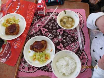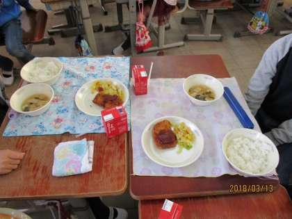 今日の給食は卒業献立。とんかつがでました。とんかつと聞いて,みんな大喜び!!自然と笑顔が溢れていました。とってもおいしく,みんなぺろりとたいらげました。