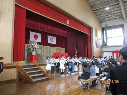 新年度がスタートしました。2年生は,昨年度と同じ教室配置ですが,みんなはりきってがんばっています。2年生の初めの役目は,入学式での「お祝いのことば」です。代表の人たちが,一生懸命がんばってくれました。いよいよお兄さんお姉さんです。1年間,はりきっていきましょう!