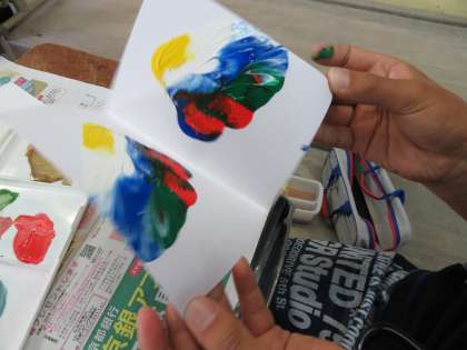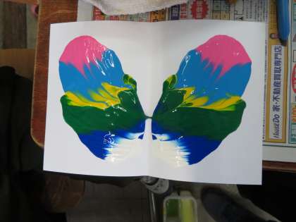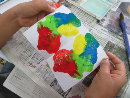 思い思いの色を画用紙にだし,半分に折って様々な模様を創っていました。