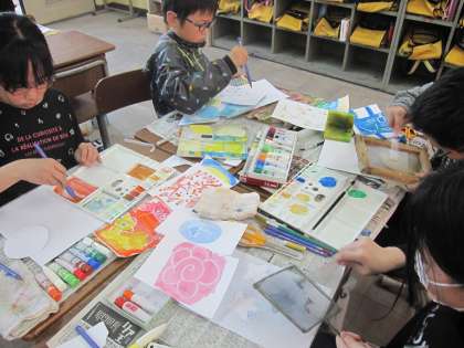 図画工作では,「心のもよう」をテーマに,いろいろな技法を使って作品を仕上げています。