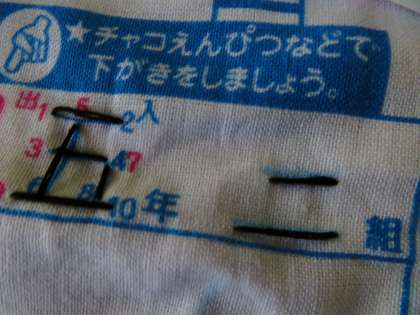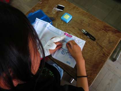 練習布に,何度も玉結びと玉どめをしています。
