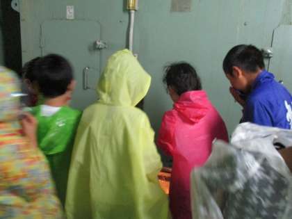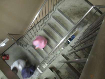最初に下水が通るのが「沈砂池」です。階段を地下に下ること13メートル。「ここでの下水の色とにおいを覚えていてくださいね。」という職員の方の言葉を受けて,かわるがわるのぞき窓から見てみました。