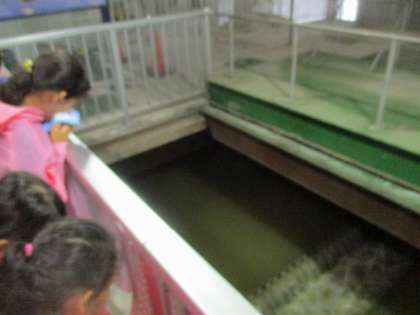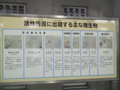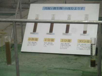 沈砂池からポンプでくみ上げた下水は,泥やごみを沈めた後,微生物の力を借りてきれいにしていきます。「まだにおいがするなあ」「でも,水はきれいになってきたよ」職員の方の話にも,流れていく水の様子にも,興味津々でした。