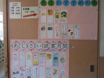 職員室前の掲示板に先生たちお勧めの本を紹介しています。