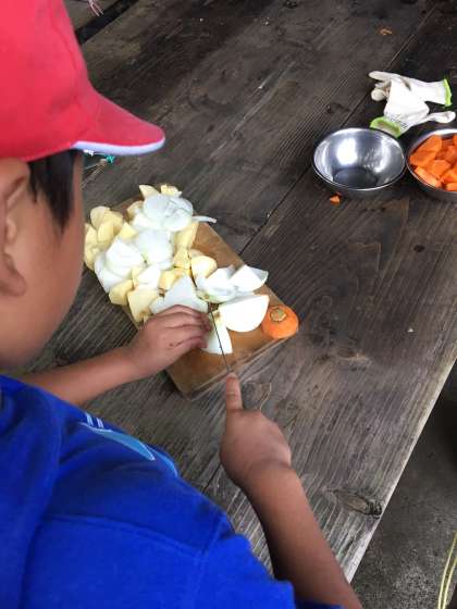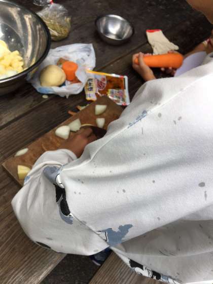 包丁を使って、上手に野菜を切っています。