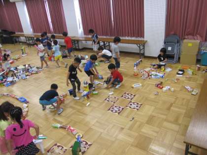 ご家庭で集めて頂いたいろいろな箱を使用し、各学級テーマを決めて、ロボットや動物、建物などをつくりました。また、タワーを作って高さ比べもしました。