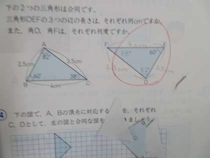 「合同な図形の辺の長さと角の大きさは等しい」という性質を使って,問題をといていました。