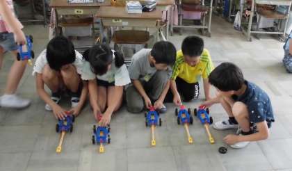 ゴムを伸ばす長さを変えて,走る距離を調べる実験をしました。