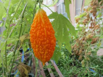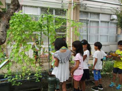 夏休みが明けて初めてのツルレイシの観察をしました。オレンジ色に熟した実を見つけて,スーパーで見る「ゴーヤ」とはちがう姿に興味津々でした。さらに中には赤い種が。まだまだ不思議なことが出てきそうです。